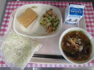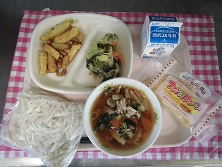 牛乳・五目うどん・大豆とポテトの揚げ煮・和風サラダ・クレープ