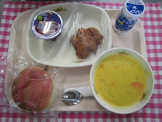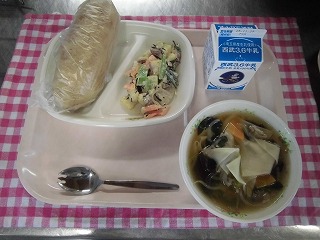 牛乳・黒糖きなこ揚げパン・彩の国サラダ・ワンタンスープ