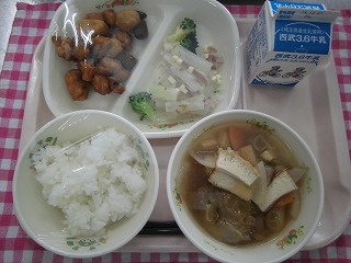 牛乳・ごはん・ふっかちゃんのきずなやきとり・お揚げのサラダ・すまし汁