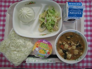 牛乳・麻婆ラーメン・お揚げのサラダ・彩の国肉まん・はちみつゆずゼリー