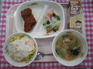 コーヒーミルク・カレーピラフドリア風・フライドチキン・クリスマスサラダ・野菜コンソメスープ