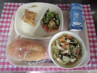 牛乳・しょうゆラーメン・大豆とポテトの揚げ煮・ヘルシーサラダ