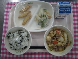牛乳・わかめごはん・ワカサギフリッター・パリパリサラダ・すき焼き風煮