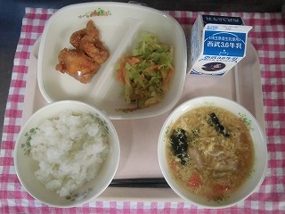 牛乳・ごはん・からあげ・ツナと野菜のミックスサラダ・中華スープ・プリン