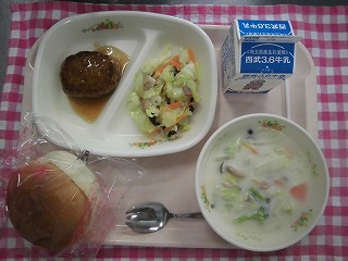 牛乳・照り焼きソースハンバーガー・キャベツのペペロンチーノ風・冬野菜のクリームシチュー