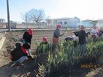昨日降った雪が、芝生に少し残っており、登校してきた子どもたちは冬の名残を見つけて嬉しそうな表情を見せていました。滅多に降らない雪に触れながら、芝生に残った雪を集めたり、友達と声を掛け合ったりするなど、短い時間ではありましたが、思い思いに雪遊びを楽しむ姿が見られました。