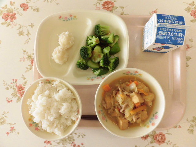 給食では、厚揚げとキャベツをたっぷりと入れています。