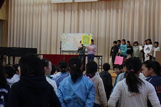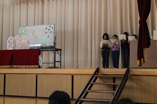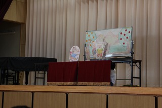 誰でも知っているお話をぺープサートで表現することで、全校が静かに見入っていました。