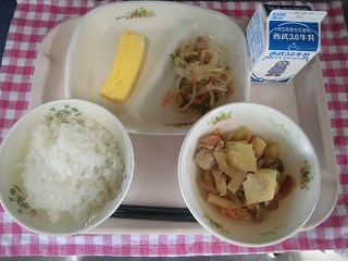 牛乳・ごはん・肉じゃが・厚焼き卵・ねぎともやしのナムル