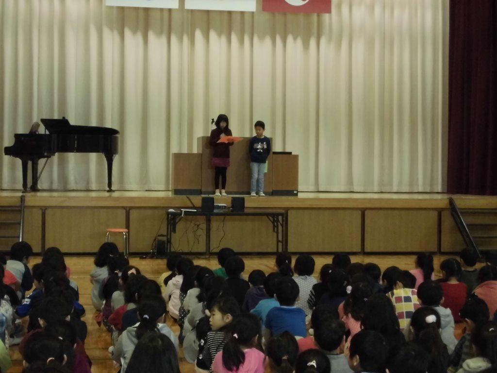 運動会や校外学習をはじめとして、たくさんの行事があった2学期。大勢の児童の活躍には素晴らしいものがありました。また、その活躍を支えてくださった保護者の皆様、地域の皆様には心より感謝申し上げます。2学期終業式には、校長先生より各学年のがんばりを褒めてもらいました。スクリーンに活躍の場面が映ると、児童から声が上がったり頷いたりと一つ一つの出来事を確認している様子が見られました。また、1年生と3年生が2学期にがんばったことやこれからがんばりたいことを壇上で発表しました。18日間の冬休みは、地域や家庭に戻っていろいろな体験をし、元気な笑顔で1月10日の始業式を迎えてください。