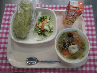オレンジジュース・抹茶入りきなこ揚げパン・ポテトのさっぱりサラダ・ワンタンスープ