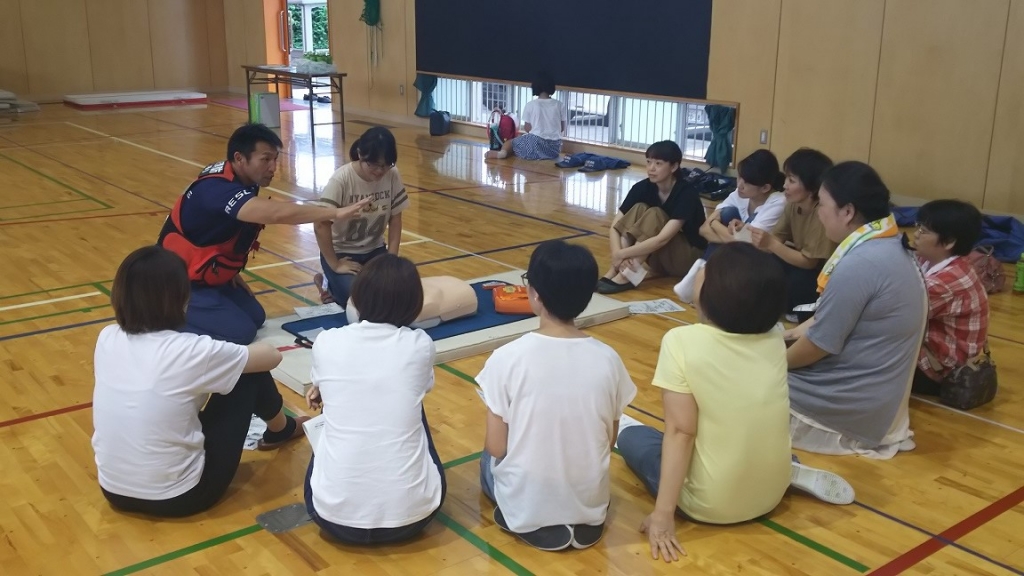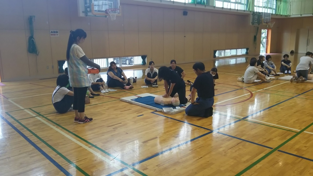 夏休みプール当番前に、応急手当の方法を確認しています。