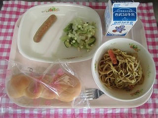 牛乳・ツイストパン・カレー風味焼きそば・焼きウインナー・チーズサラダ