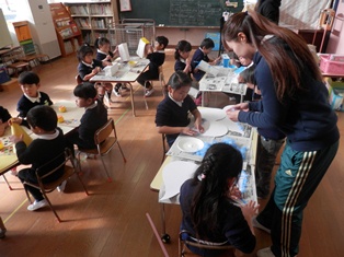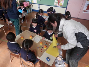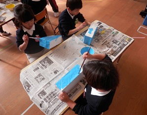 帽子や羽などに色をぬったり、羽を付けてしあげていきました。