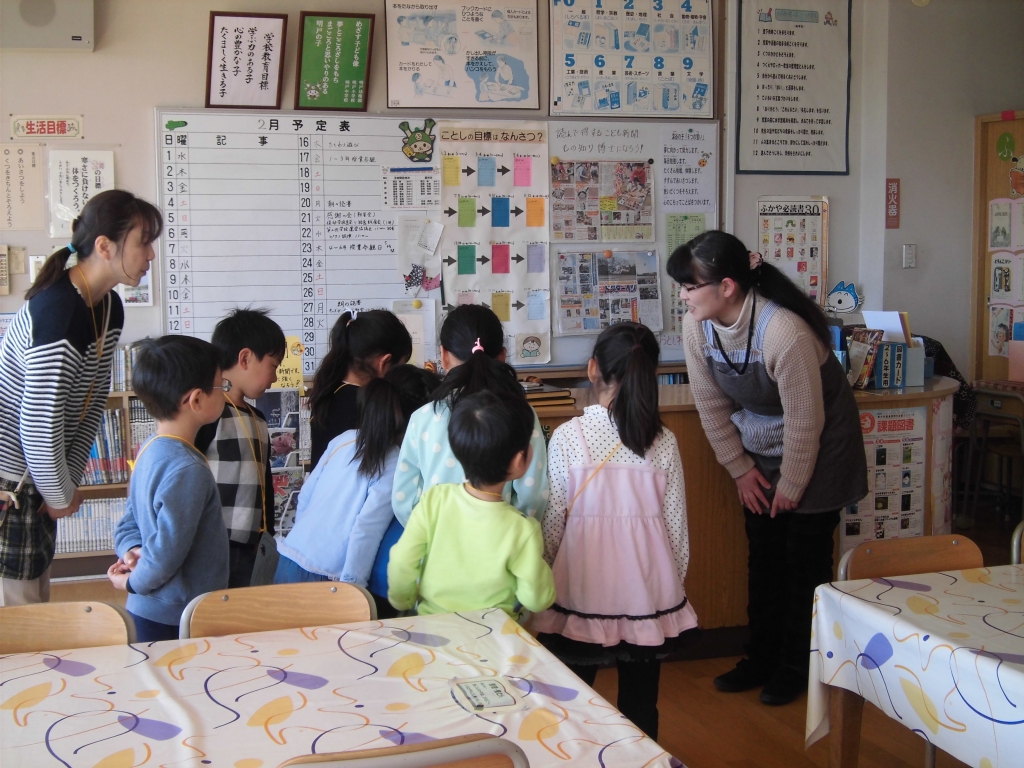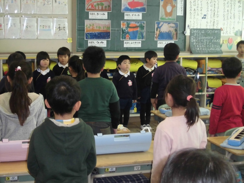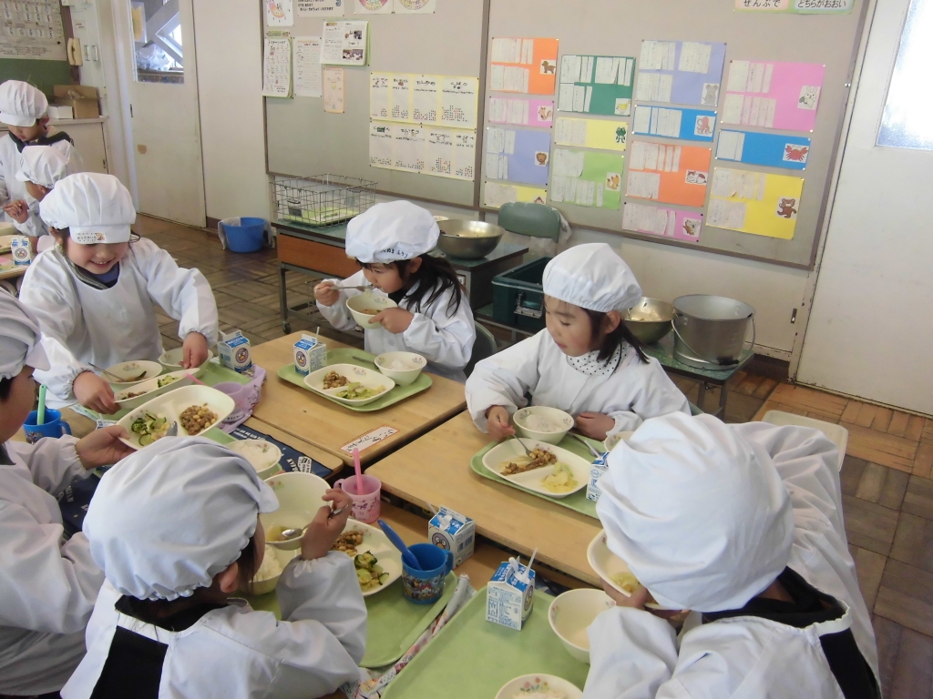 明戸保育園児と明戸幼稚園児が学校探検に来ました。1年生の靴箱を見たり、保健室や図書室を見たりしました。明戸保育園児は、校舎の広さと図書室にある本の多さにびっくりしていました。探検の後は、1年生の教室を訪問しました。1年生から校歌と鍵盤ハーモニカの演奏、詩の暗唱の歓迎を受け、緊張の中にも入学への期待を膨らませていました。その後、明戸保育園児は、1年生の教室で給食を試食しました。小学校で使う給食用エプロンも用意し、学校給食が待ち遠しい給食試食会でした。