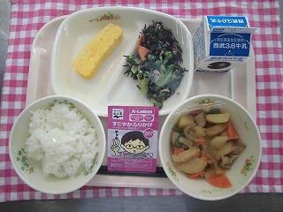 牛乳・ごはん・ふりかけ・厚焼き卵・ツナとひじきのサラダ・肉じゃが