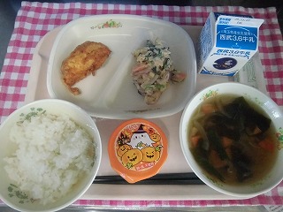牛乳・ごはん・からあげ・さつまいもとツナのサラダ・中華スープ・パンプキンババロア