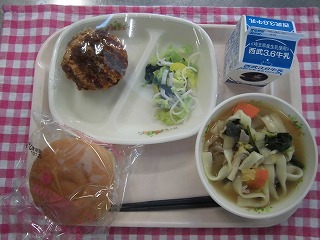 牛乳・エビカツバーガー・シルクサラダ・煮ぼうとう