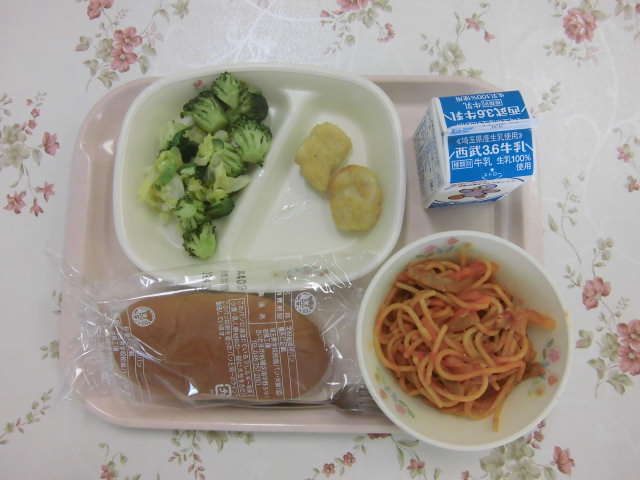 ナポリタンの赤色とグリーンサラダの緑色で色合いの良い給食です。