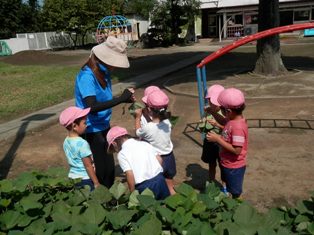 今日は、園庭で4歳児が芋のつるで遊びました。