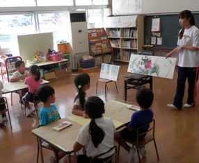 5歳児は、保育室で絵本の読み聞かせをしました。