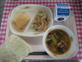 牛乳・サンマーメン・大根とじゃこのサラダ・メープルパンケーキ