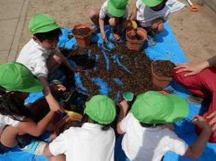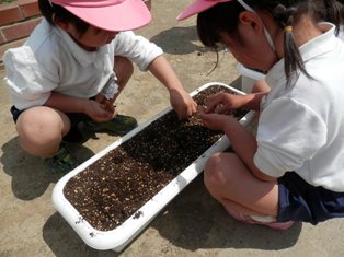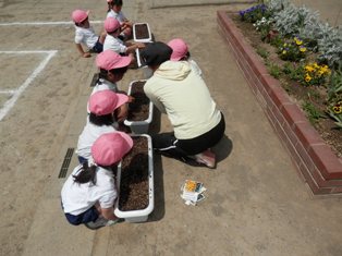5歳児は土づくりからやり、4歳児は小さな種を土の中に埋めました。