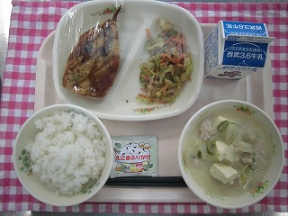 牛乳・ごはん・えごまふりかけ・銚子産イワシフライ・骨丸ごとおかか和え・スタミナスープ
