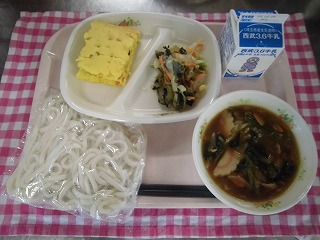 牛乳・カレーうどん・かぼちゃパンケーキ・小松菜とじゃこの炒り煮