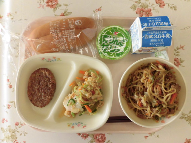 パンを半分にし、一つにハンバーグを、もう一つに焼きそばを挟みました。
