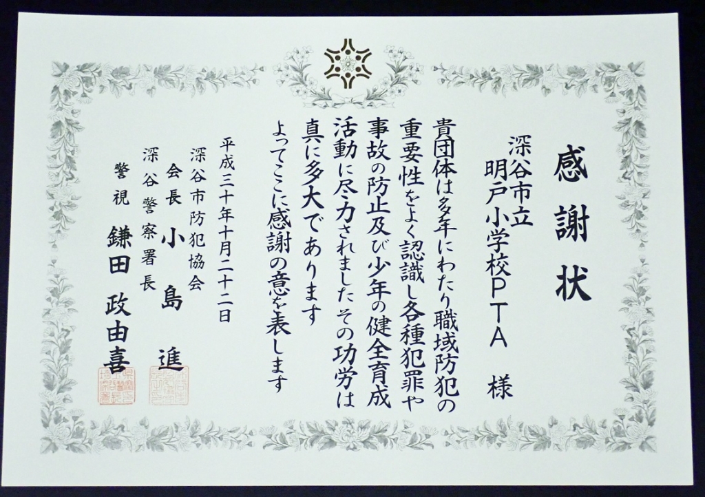 本日、深谷市防犯大会表彰式に河合PTA会長が参加してきました。