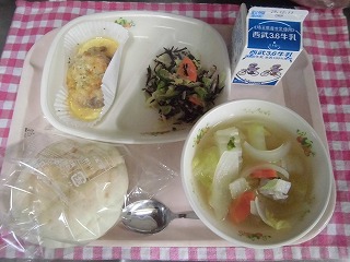 牛乳・メロンパン・チキンの香味焼き・ツナとひじきのサラダ・ポトフ