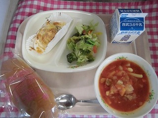 牛乳・黒パン・チキンのフレーク焼き・イタリアンサラダ・ミネストローネ