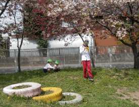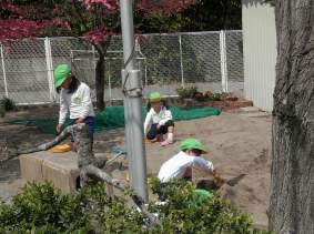 庭の八重桜やたんぽぽの花をつみ、首飾りを作ったし、砂場でケーキ作りをして遊びました。