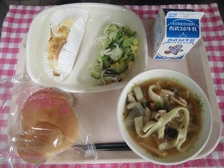 牛乳・フラワーロールパン・チキンのフレーク焼き・シルクサラダ・煮ぼうとう
