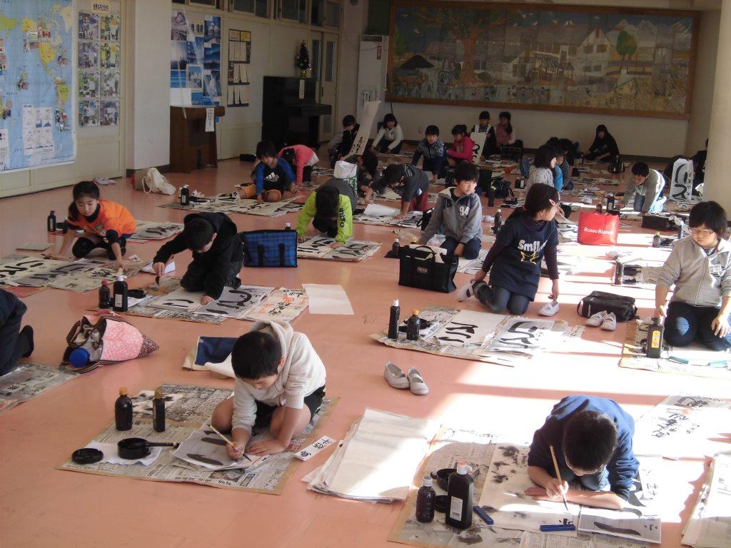 今日は、1~6年生まで書きぞめ制作会が行われました。冬休みの宿題等で、いっしょうけんめい練習した成果を発揮し、最後まであきらめず、書いていました。児童のみなさんの作品は、13日(金)~17日(火)の午後1時30分より4時30分まで、各教室の廊下に展示されています。ぜひご覧ください。