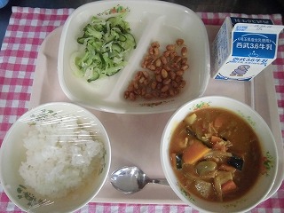 牛乳・夏野菜のカレーライス・グリーンサラダ・大豆のカリカリ揚げ