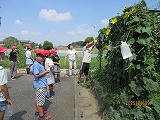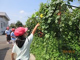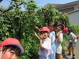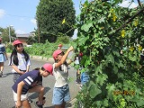 5年生が理科の学習で、ヘチマの雌花に袋をかける観察を行いました。この活動は、ヘチマの実ができるためには雄花の花粉が必要であることを調べるためのものです。袋をかけておくと、虫や風で自然に花粉がつかないので、あとから自分たちで花粉をつけて確かめることができます。