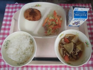 牛乳・ごはん・かぼちゃコロッケ・たくあんサラダ・大根と豚肉の煮込み
