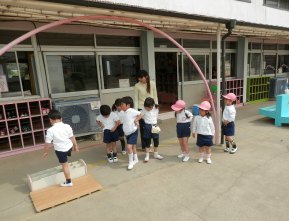 園庭で遊んだ後、先生に「手洗い、うがい」の仕方を教えてもらい保育室に入りました。