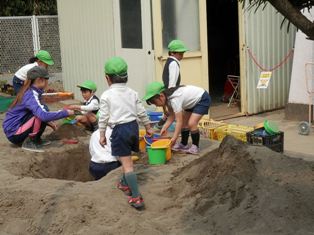5歳児 きりん組は、友だちと協力して砂遊びを楽しんでいました。
