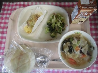牛乳・ごはん・鰆のみそマヨネーズ焼き・キャベツのペペロンチーノ風・けんちん汁・ミニクレープ(イチゴ)