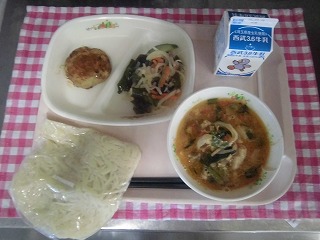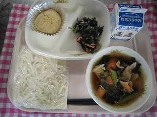 牛乳・肉うどん・ほうれん草とひじきのサラダ・マーラーカオ