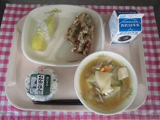 牛乳・わかめごはんおにぎり・ちくわの石垣揚げ・豚汁・バナナ