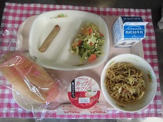 牛乳・コッペパンスライス・焼きウインナー・春キャベツとジャコチーズのサラダ・ソース焼きそば・カップでヤクルト