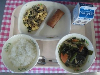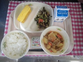 牛乳・ごはん・えごまふりかけ・じゃが豚キムチ・厚焼き卵・ツナとひじきのサラダ